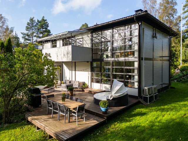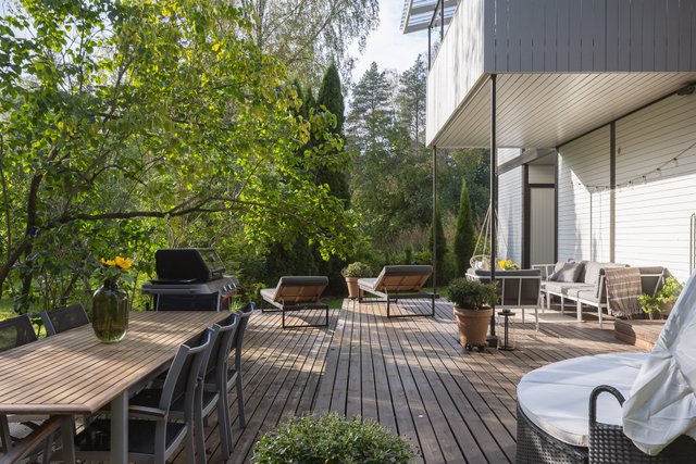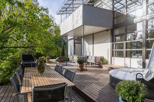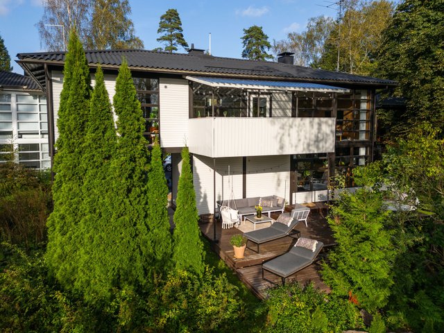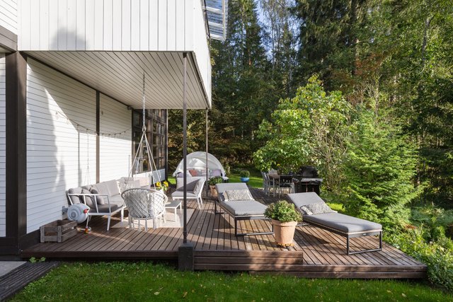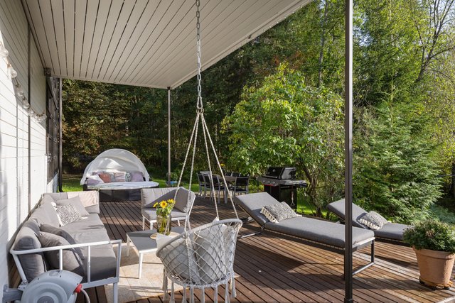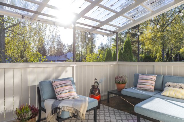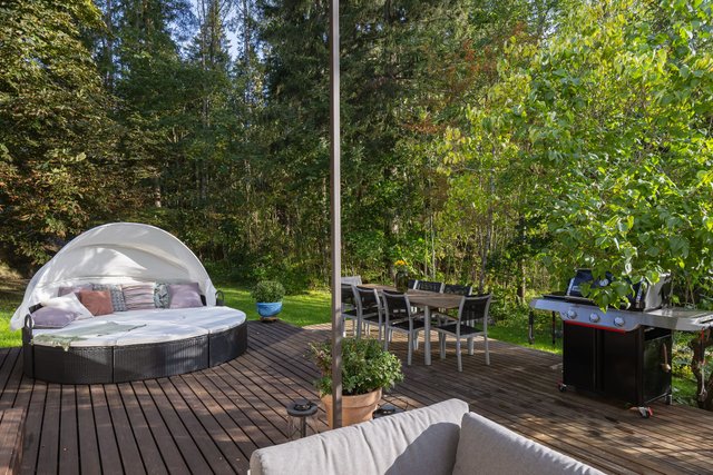 Bungalow tyylisen talon etelään suuntautuva suojaisa terassi ja piha tarjoavat upeat mahdollisuudet nauttia auringosta ja ulkoilmasta. Lisäksi oma metsään rajautuva piha tarjoaa runsaasti tilaa lasten leikeille ja puutarhanhoidolle.