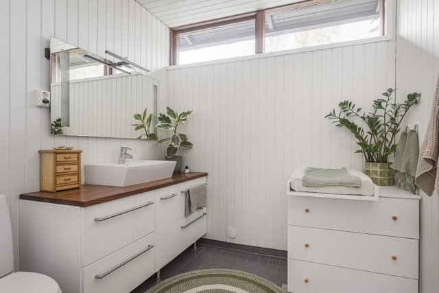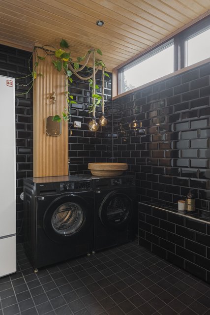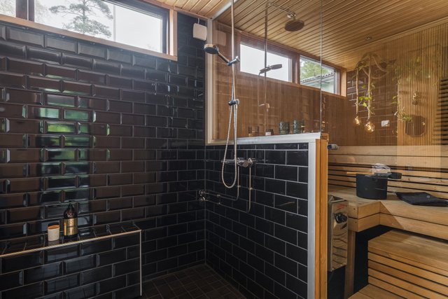 - Asunnossa on kaksi kylpyhuonetta, yksi kummassakin kerroksessa – täydellinen ratkaisu arjen sujuvuuteen. Molemmissa on lattialämmitys ja ikkunat, jotka tuovat mukavuutta, luonnonvaloa ja raikkautta tiloihin. Yläkerran kylpyhuoneessa on varaus suihkulle sekä lattiakaivo, allaskaappi, wc-istuin, pesuallas ja valaistu peili. Lisäksi tilassa on liitäntä pyykinpesukoneelle, ja tänne on mahdollista lisätä esimerkiksi amme, jos kaipaat arkeen ripauksen ylellisyyttä. Alakerran kylpyhuone & saunaosasto on tunnelmallinen kokonaisuus, jossa mustat laatat ja puurimoituksen yksityiskohdat luovat spa-henkisyyttä. Tilassa on suihku, pesukoneliitäntä ja laatoitetut pinnat kauttaaltaan.