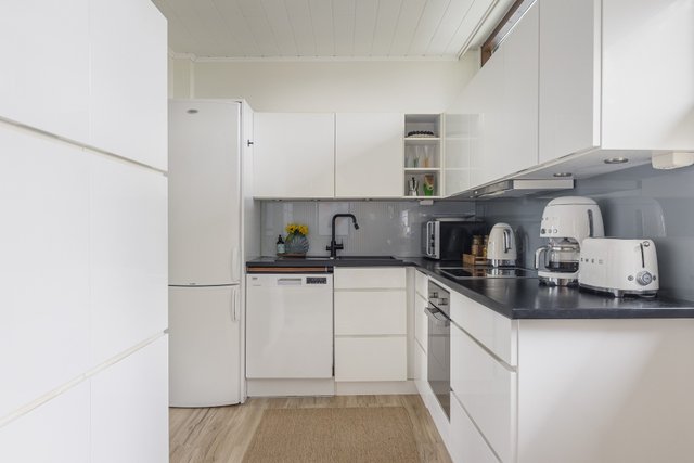 - Tämä vaaleasävyinen keittiö hurmaa ajattomuudellaan ja toimivuudellaan. Tässä kauniissa keittiössä löytyy runsaasti säilytys- ja laskutilaa. Varusteluun kuuluvat induktioliesi, uuni, astianpesukone, jääkaappipakastin, liesituuletin sekä kätevä apteekkarinkaappi, joka helpottaa arjen säilytystä. Lattiamateriaalina vinyylilankkulattia ja välitilassa lasi. Keittiöön mahtuu myös aamiaispöytä, jonka takana oleva kaunis tehostepaneeliseinä luo sisustuksellista ilmettä ja kodikkuutta. Suuret ikkunat päästävät runsaasti luonnonvaloa, tehden tilasta erityisen viihtyisän ja avaran. Tämä keittiö tarjoaa erinomaiset puitteet niin arkikokkailuun kuin suurempiinkin illanviettoihin.