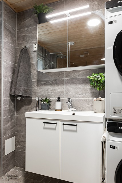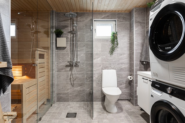 - Varustus: Sadesuihku, WC-istuin, kääntyvä suihkuseinä, allaskaappi, peilikaappi, pesukoneliitäntä (pesutorni), sähköinen lattialämmitys, kiinteä kaappi ja kiinteät valaisimet. Materiaalit: Saunan seinä lasitettu, lattia- ja seinäpinnat laatoitettu.