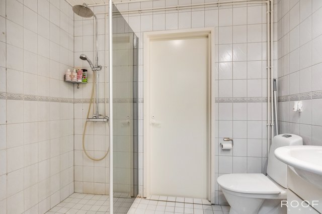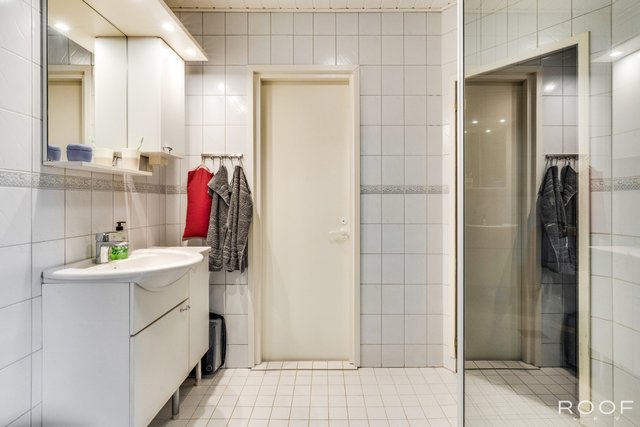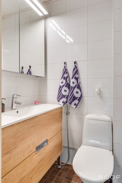 - WC-istuin, suihku, lattialämmitys, allaskaappi, pesuallas, ja peili