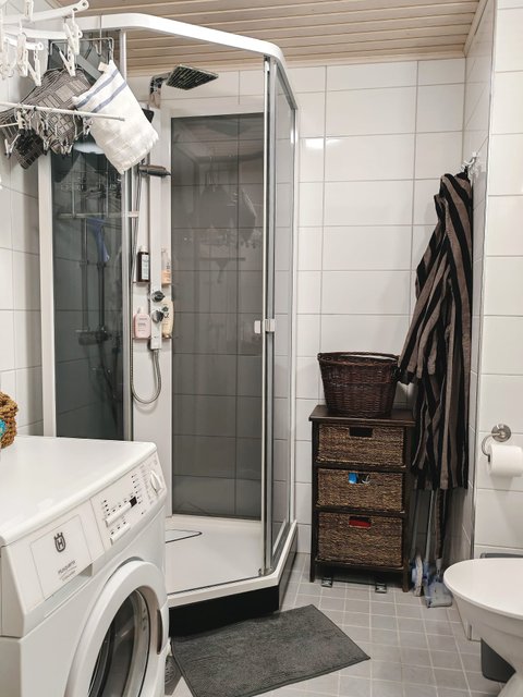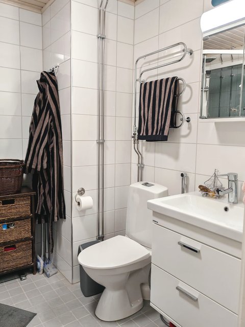 - WC-istuin, suihkukaappi, pesukoneliitäntä, peilikaappi, pesuallas, allaskaappi, ja bidee-suihku