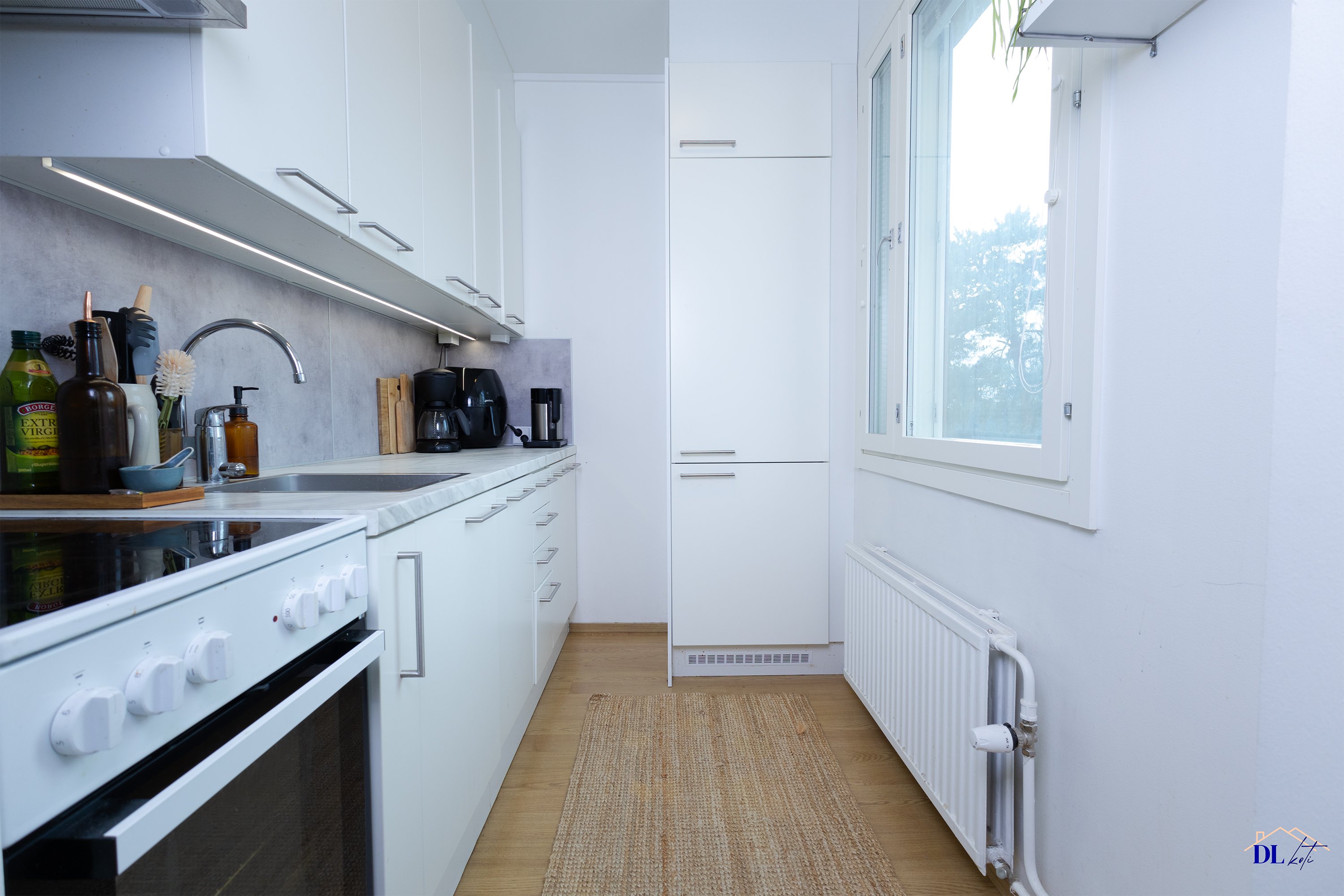 - Keittiöremontti tehty 2021. Täysremontti kaapistojen, hanan ja kodinkoneiden osalta, uusi työtaso ja välitilan laminaattilevy. Uudet alakaapit, uudet yläkaapit, integroitu jääkaappipakastin sekä integroitu astianpesukone. Uusi hana astianpesukoneliitännällä. Liesituulettimen asennus aktiivihiilisuodattimella, yhden valaisimen poiskytkentä seinästä liesituulettimen tieltä, asennettu led-valaisinlista koteloituna ja vesiroiskesuojattuna keittiökaappien alle, yksi lisäsähköpistoke asennettu keittokomeroon, uusi sähköpistoke asennettu astianpesukoneliitäntää varten. Seinät tasoitettu ja maalattu.