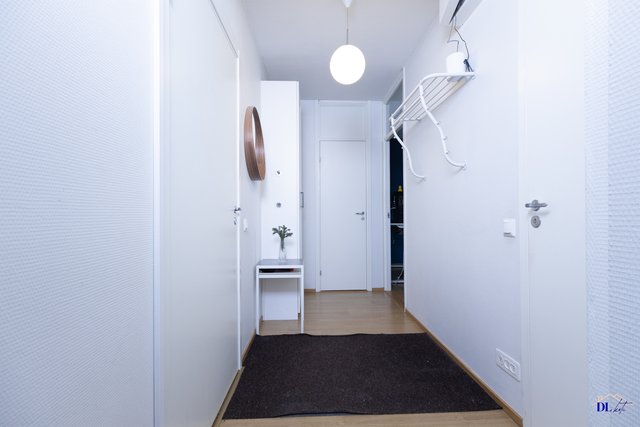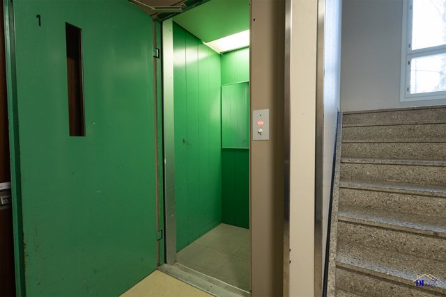 Ylimmän kerroksen valoisa kaksio hissitalossa.