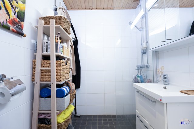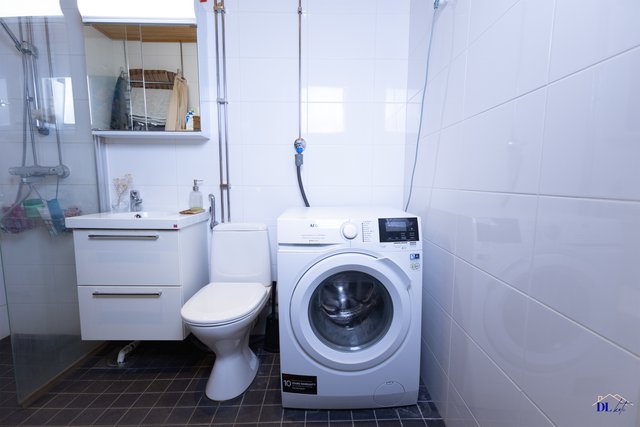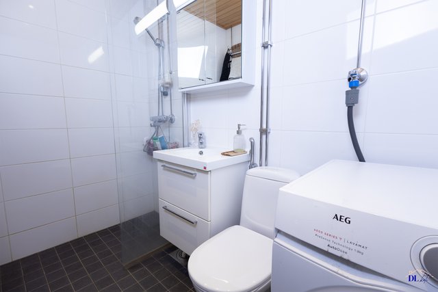 - WC-istuin, suihku, pesukoneliitäntä, lattialämmitys, pesuallas, peilikaappi, ja bidee-suihku