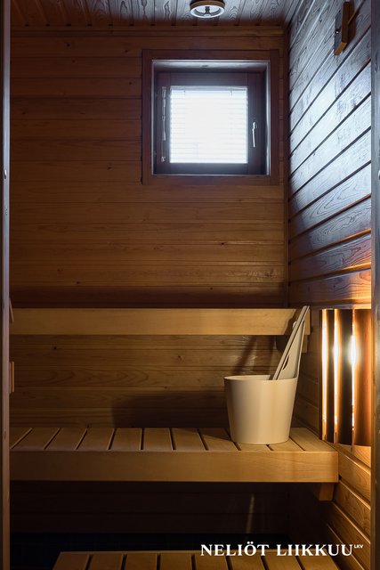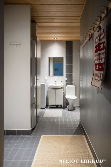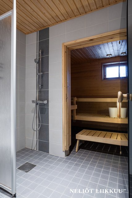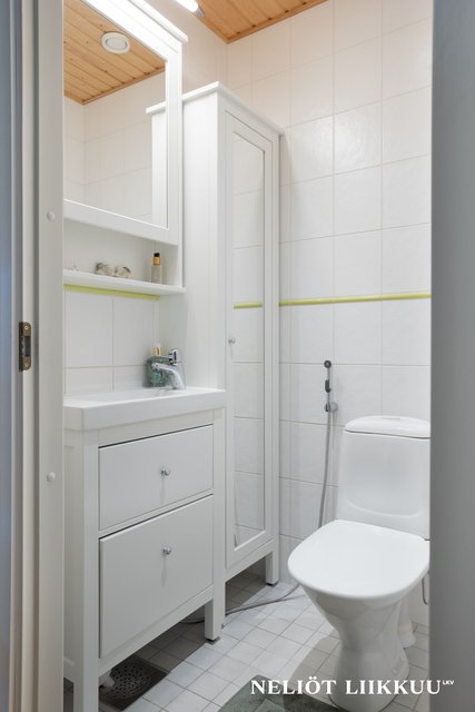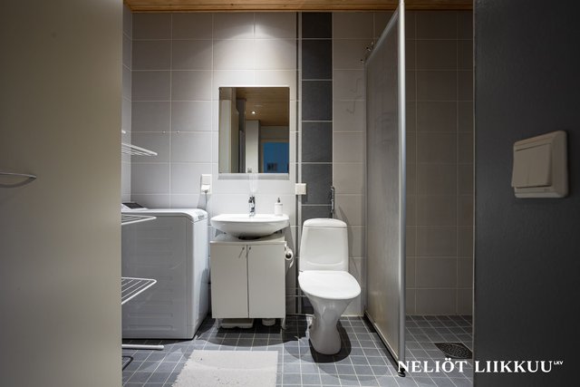 - Suihku, suihkuseinä, pesukoneliitäntä, lattialämmitys, allaskaappi, bidee-suihku, ja wc-istuin