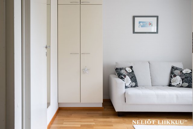 Asunnon pohjaratkaisu on selkeä ja toimiva: kolme makuuhuonetta, avara olohuone–keittiö -kokonaisuus sekä hyväkuntoiset pesutilat ja erillinen wc. Lattiat ovat parkettia ja laattaa, ja seinäpinnat maalattuja tai tapetoituja – helppoja pitää siisteinä ja muunnella oman maun mukaan.
