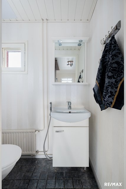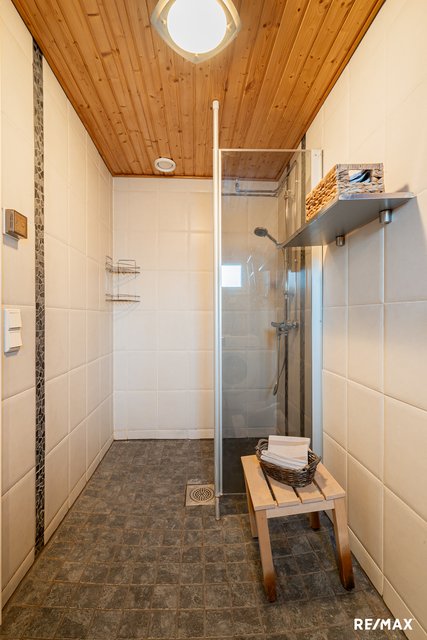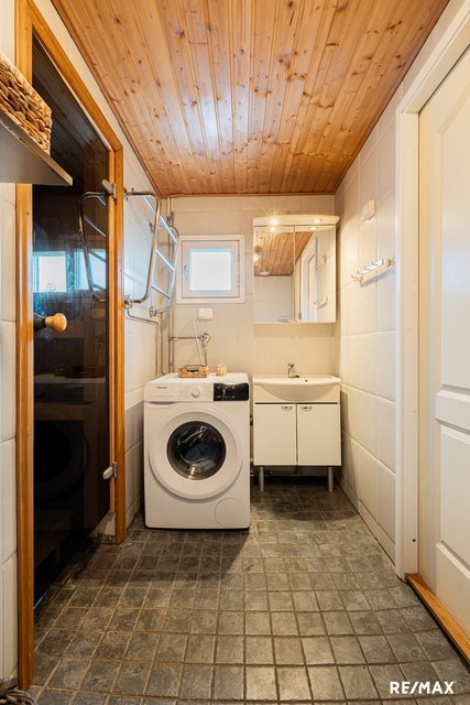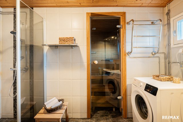 - Suihku, pesukoneliitäntä, lattialämmitys (sähkö), pesuallas, peilikaappi, allaskaappi, ja suihkuseinä