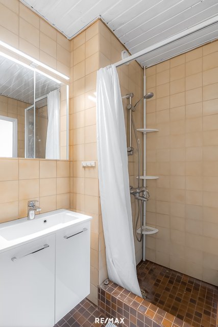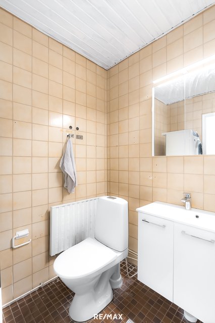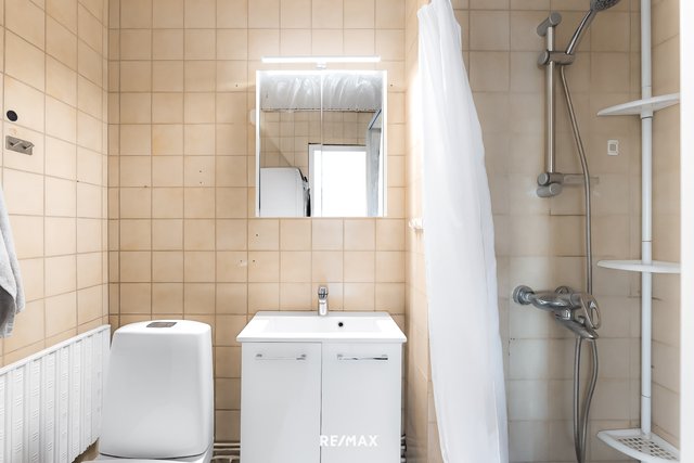 - WC-istuin, suihku, pesukoneliitäntä, lattialämmitys, peilikaappi, pesuallas, ja allaskaappi