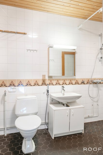 - WC-istuin, suihku, pesukoneliitäntä, pesuallas, peili, allaskaappi, ja bidee-suihku