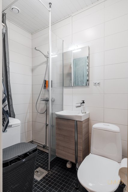 - WC-istuin, suihku, pesukoneliitäntä, peilikaappi, pesuallas, allaskaappi, ja bidee-suihku
