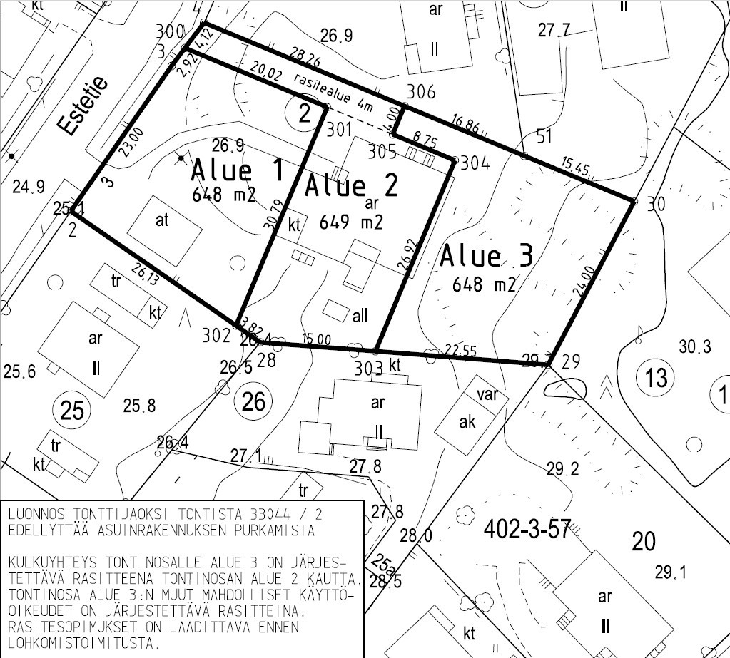 - Asemakaavan mukaan rakennusoikeus on e=0,25. Mikäli tontille rakennetaan kolme omakotitaloa, niin kokonaiskerrosala per määräosa on n. 162 m2.
