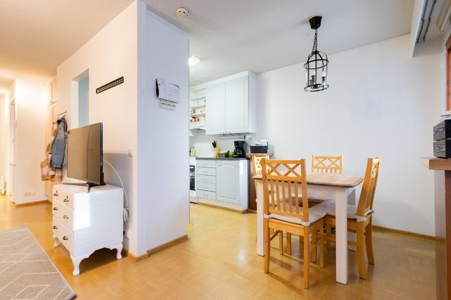 Keittiön yhteydessä on tilaa ruokapöydälle. Olohuoneesta pystyt helposti suunnittelemaan oman viihtyisän rentoutumispaikan.