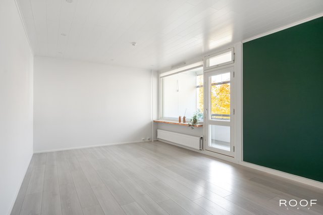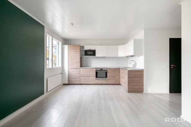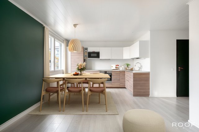 Avara ja valoisa olohuone on juuri saanut uuden maalipinnan kesällä 2025. Olohuoneesta on käynti lasitetulle parvekkeelle, josta avautuvat länteen suuntautuvat näkymät. Keittiö on varusteltu integroiduilla kodinkoneilla, induktioliedellä ja astianpesukoneella – kaikki valmiina sujuvaan arkeen.