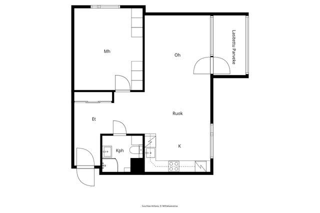 - Kohteen markkinoinnissa käytetään mittatiedoilla varustettua pohjapiirrosta. Pohjapiirroksen tarkoitus on helpottaa ostajan ostopäätöstä ja selvittää asunnon nykyinen huonejako. Lukija on tietoinen, että pohjakuva on suuntaa antava, ei mittakaavassa, eikä perustu virallisiin piirustuksiin. Välitysliike, myyjä, eikä pohjakuvan laatija ole vastuussa, mikäli pohjakuvan mittasuhteet eivät todellisuudessa vastaa pohjakuvassa mainittuja mittasuhteita. Lukijan on tärkeää ymmärtää, että mittasuhteet voivat heittää kuvassa mainitusta enemmän tai vähemmän. Myytävän kohteen pinta-alatiedot selviävät myyntiesitteestä, eikä pohjakuvan mittatietojen pohjalta voida laskea/olettaa muita pinta-alatietoja.