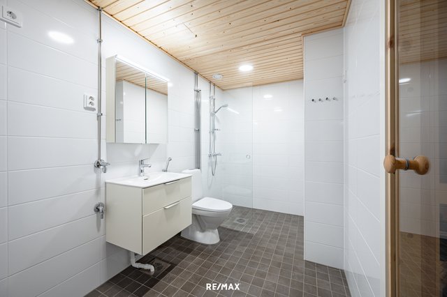 - -Suihku -Suihkuseinä -Allaskaappi -Peilikaappi -WC -Käsisuihku -Pesukoneliitäntä Lattia: laatta Seinät: laatta