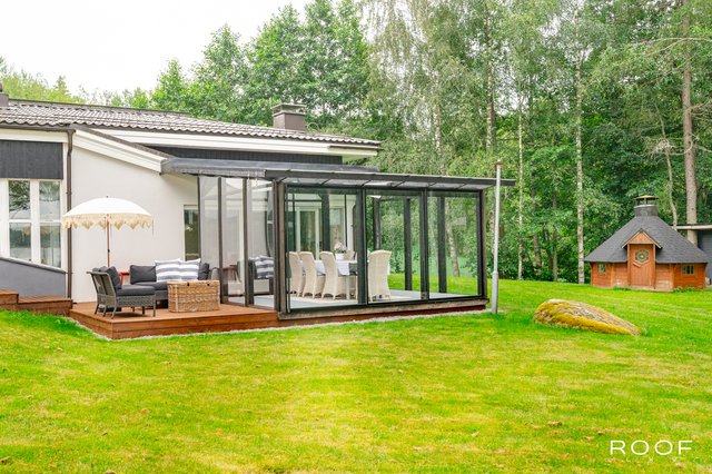 - Takkahuone, josta on käynti ulos isolle lasitetulle terassille.