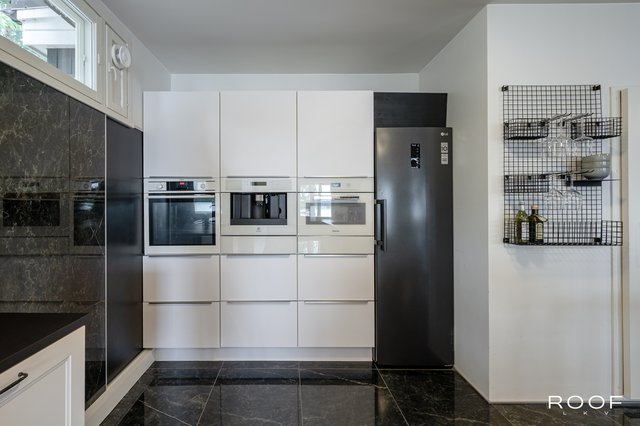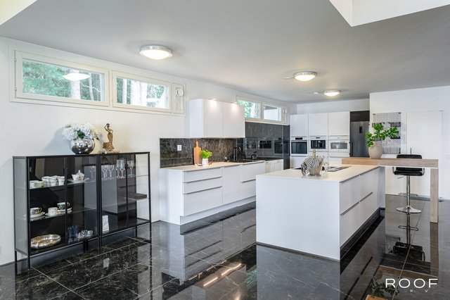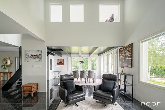 The house of approx. 343m2 includes 8 rooms, open kitchen, 2 bathrooms, sauna, fireplaceroom, loft, gym, dressingrooms and a 2-car heated garage, which makes the total area approx. 402m2.