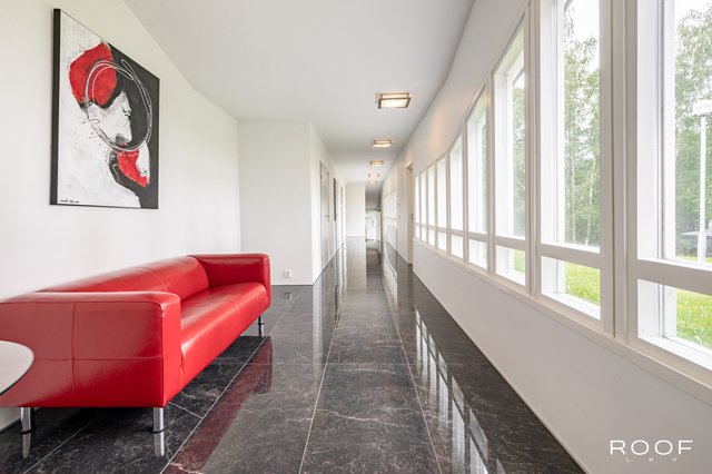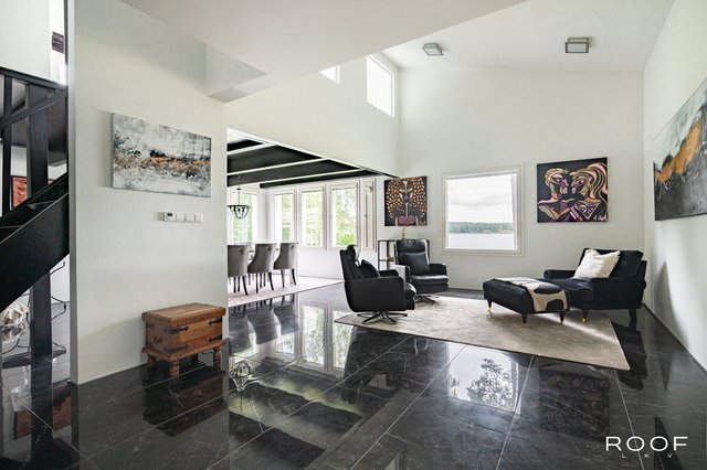 Lämminhenkinen, tilava asunto (n. 343 m²) tarjoaa yhteensä kahdeksan huonetta sekä keittiön, kaksi kylpyhuonetta, saunan, takkahuoneen, parven, kuntosalin, useita vaatehuoneita ja kahden auton lämpimän autotallin. Kokonaispinta-ala on noin 402 m².