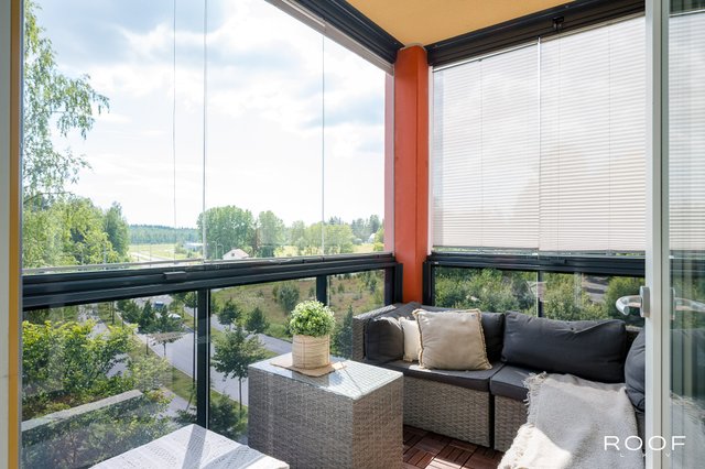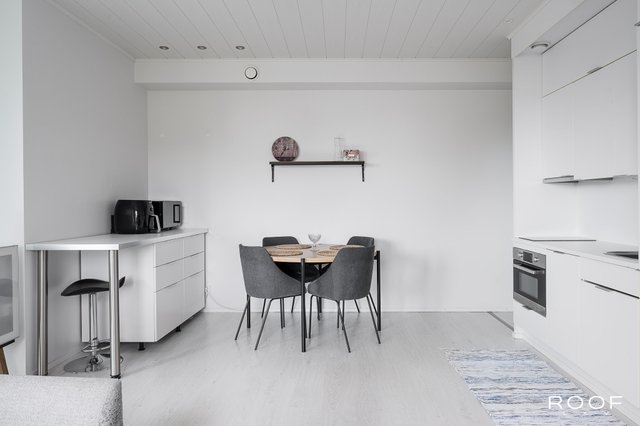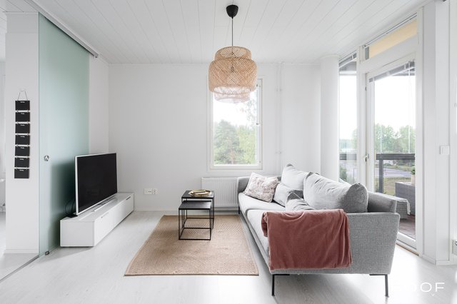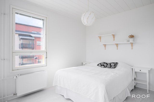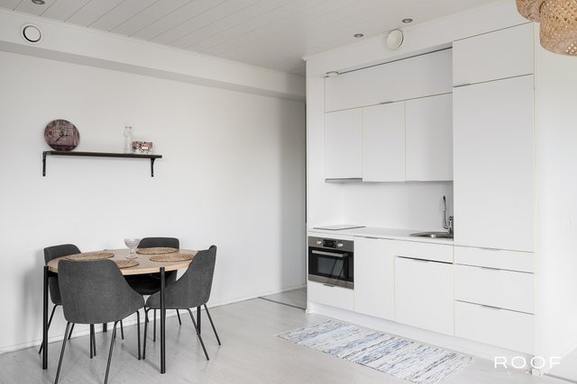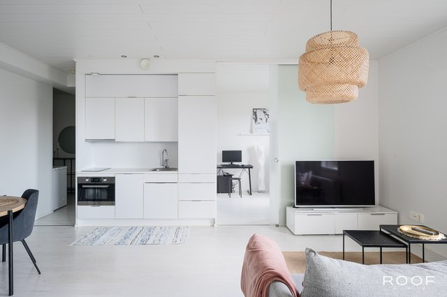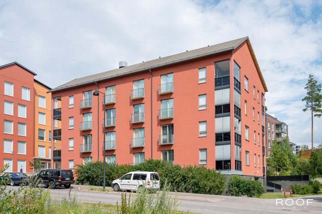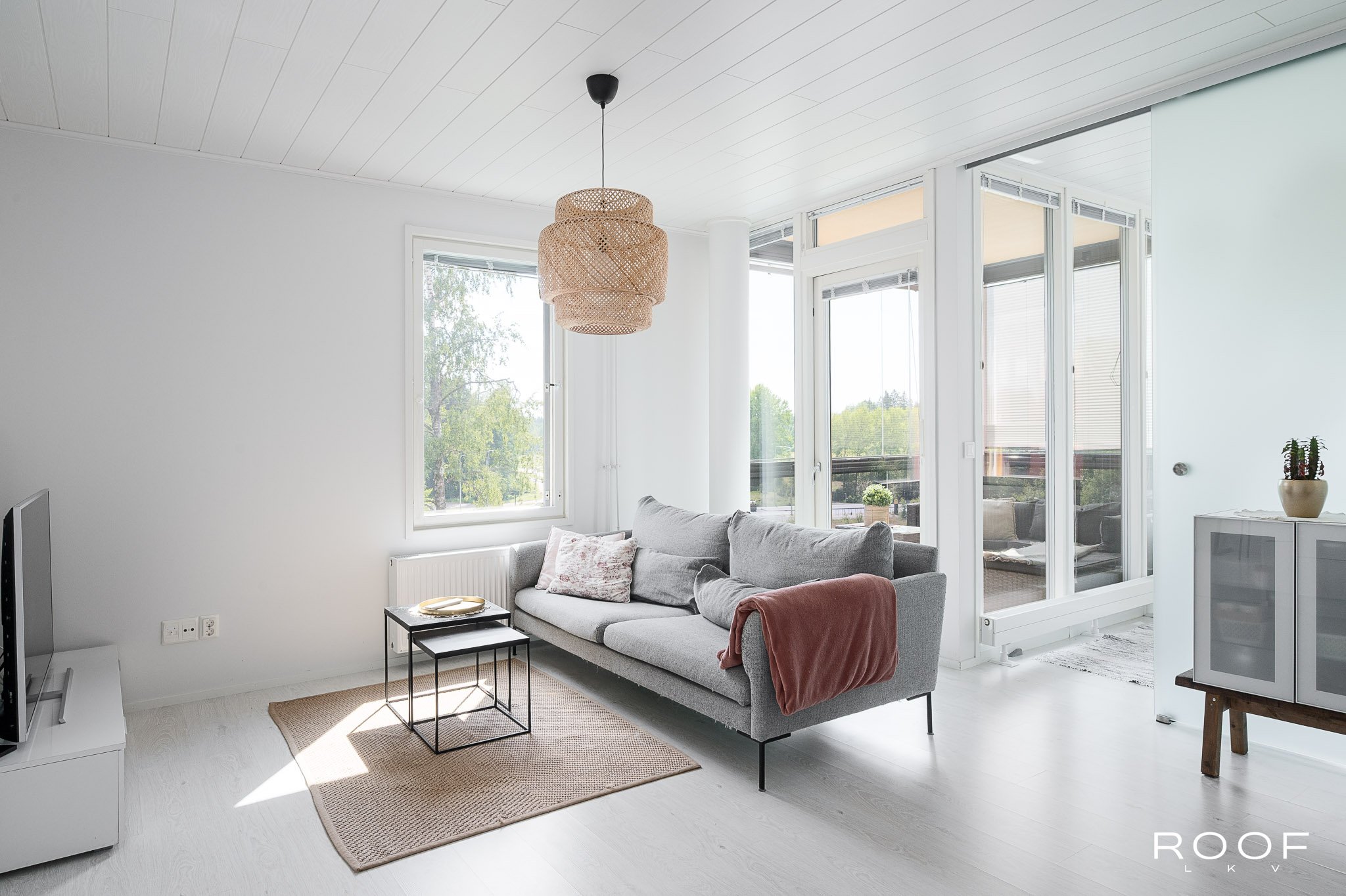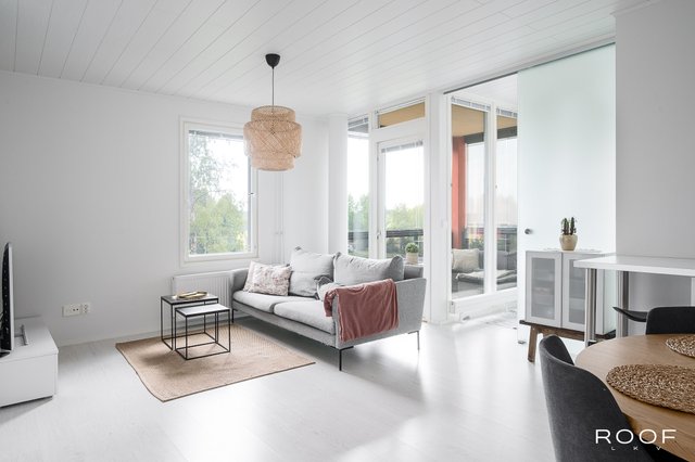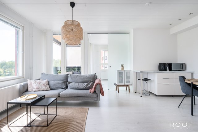 Myytävä huoneisto on tehoneliöinen kolmio, josta upeat esteettömät näkymät parvekkeelta. Asunnon sydämenä toimii yhtenäinen keittiö ja olohuone, josta pääsy molempiin makuuhuoneisiin sekä asunnon aurinkoiselle parvekkeelle.