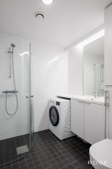 - WC-istuin, suihku, suihkuseinä, lattialämmitys, pesukoneliitäntä, peili, allaskaappi, ja bidee-suihku
