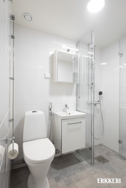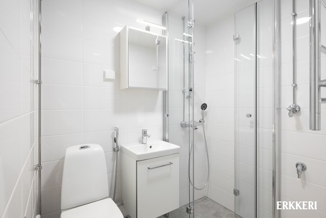 - WC-istuin, suihku, suihkuseinä, pesukoneliitäntä, lattialämmitys, peilikaappi, pesuallas, allaskaappi, ja bidee-suihku