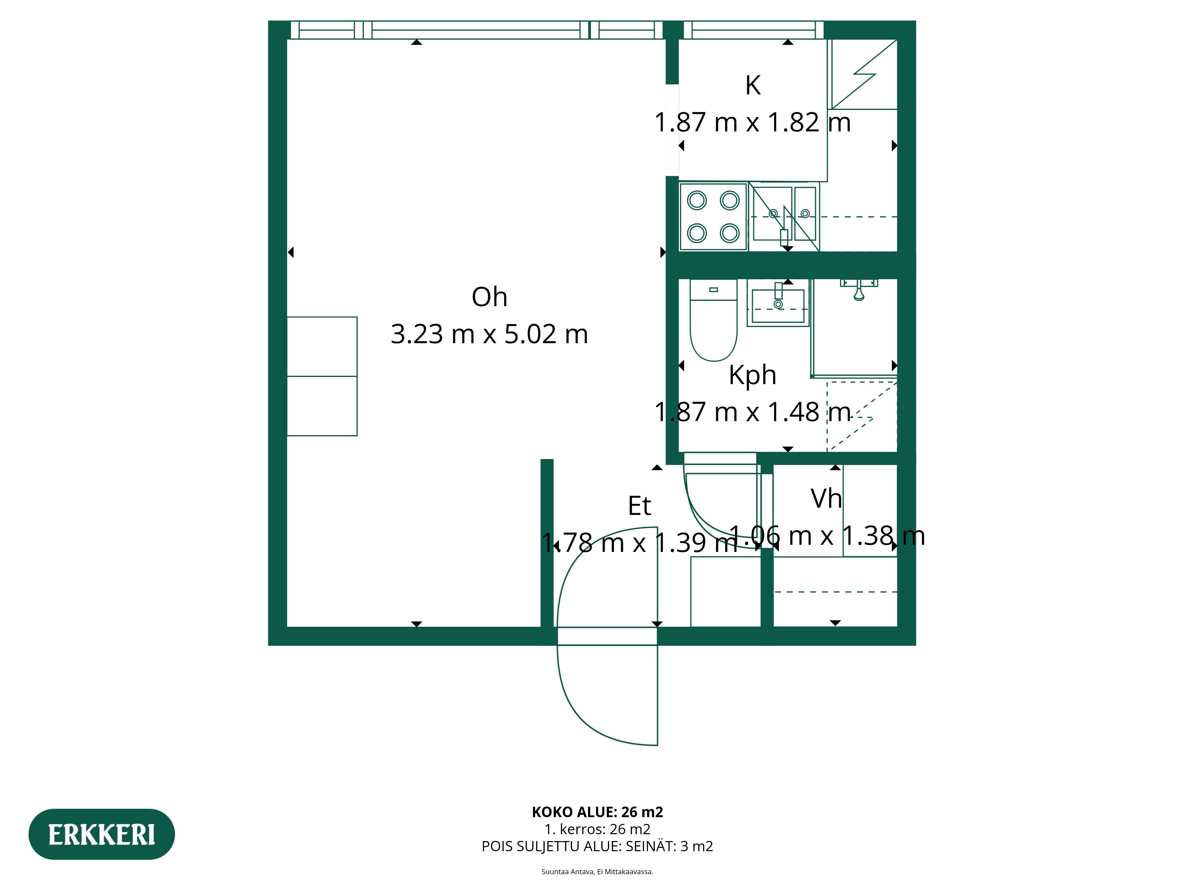 - Yhtiöjärjestyksen mukainen, Isännöitsijäntodistuksen mukainen, (Pinta-ala ei ole tarkistusmitattu ja todellinen pinta-ala voi olla suurempi tai pienempi, kuin ilmoitettu)