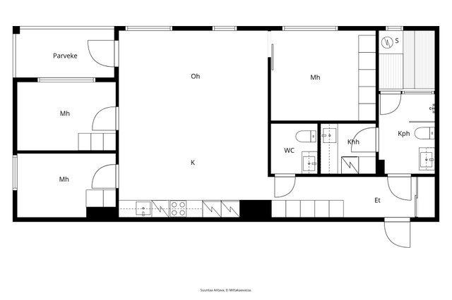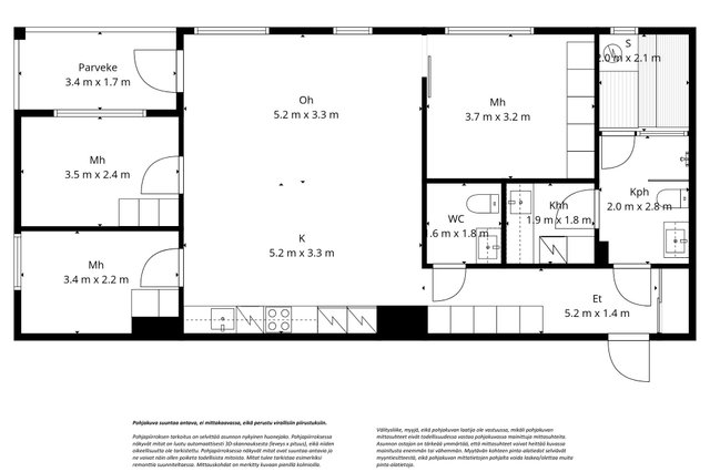 - Kohteen markkinoinnissa käytetään mittatiedoilla varustettua pohjapiirrosta. Pohjapiirroksen tarkoitus on helpottaa ostajan ostopäätöstä ja selvittää asunnon nykyinen huonejako. Lukija on tietoinen, että pohjakuva on suuntaa antava, ei mittakaavassa, eikä perustu virallisiin piirustuksiin. Pohjapiirroksessa näkyvät mitat on luotu automaattisesti 3D-skannauksesta (leveys x pituus), eikä niiden oikeellisuutta ole tarkistettu. Pohjapiirroksessa näkyvät mitat ovat suuntaa antavia ja ne voivat näin ollen poiketa todellisista mitoista. Mitat tulee tarkistaa esimerkiksi remonttia suunniteltaessa. Mittauskohdat on merkitty kuvaan pienillä kolmioilla. Välitysliike, myyjä, eikä pohjakuvan laatija ole vastuussa, mikäli pohjakuvan mittasuhteet eivät todellisuudessa vastaa pohjakuvassa mainittuja mittasuhteita. Lukijan on tärkeää ymmärtää, että mittasuhteet voivat heittää kuvassa mainitusta enemmän tai vähemmän. Myytävän kohteen pinta-alatiedot selviävät myyntiesitteestä, eikä pohjakuvan mittatietojen pohjalta voida laskea/olettaa muita pinta-alatietoja.