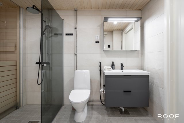 - Varustus: Suihku, Suihkuseinä, Wc istuin, Pesukoneliitäntä, Hana, Allas, Peilikaappi, Allaskaapisto, Lattialämmitys Seinämateriaali: Laatta Lattiamateriaali: Laatta