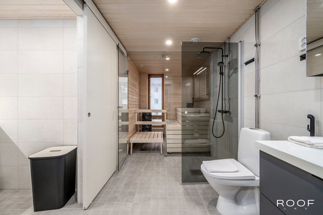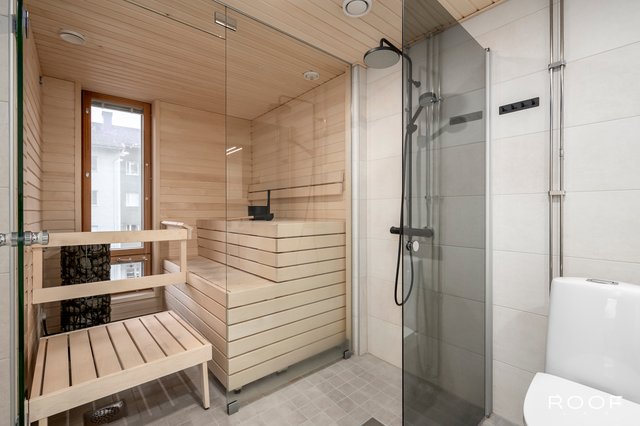 Kodin oma sauna tarjoaa rentouttavia hetkiä päivän päätteeksi. Sauna on varusteltu Harvia Cilindro -kiukaalla, ja peseytymistiloissa on sadesuihkulla varustettu suihkusetti.