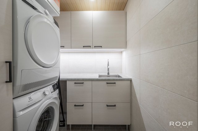 Erillinen kodinhoitohuone helpottaa arkea: oma vesipiste, kaapistot ja paikka pyykkihuollolle tuovat järjestystä ja huolettomuutta asumiseen. Lisäksi kodissa on erillinen WC.