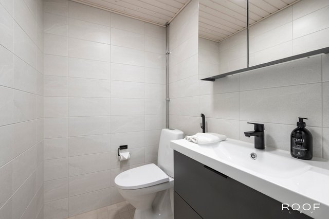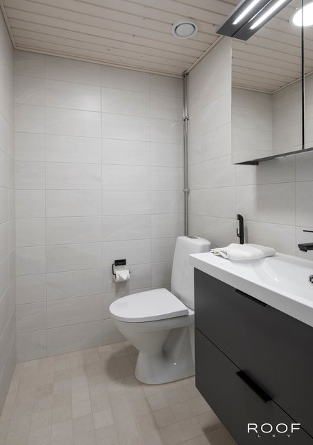 - WC-tilojen katossa valkovahattu kuusipanelointi