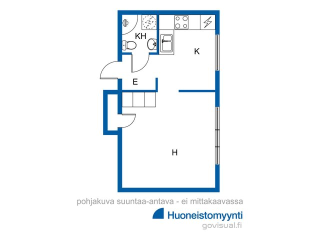 - Lattialiesi, liesituuletin, jääkaappipakastin, kaapistot, laatikostot