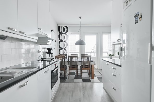 - Jääkaappi, jääkaappipakastin, erillisuuni, liesi, liesituuletin, ja astianpesukone