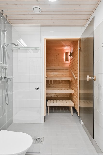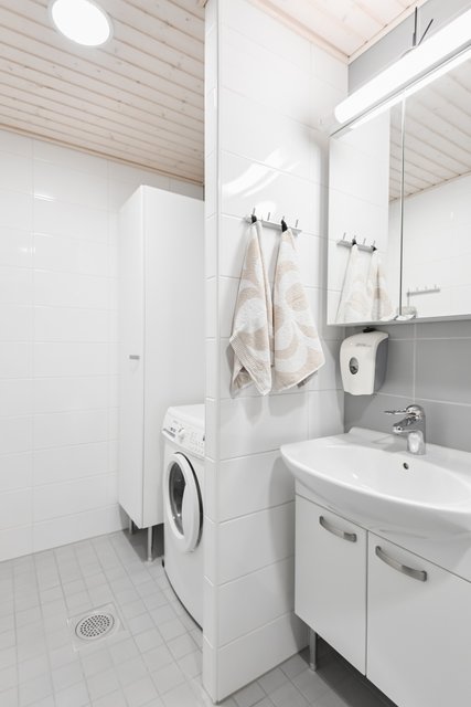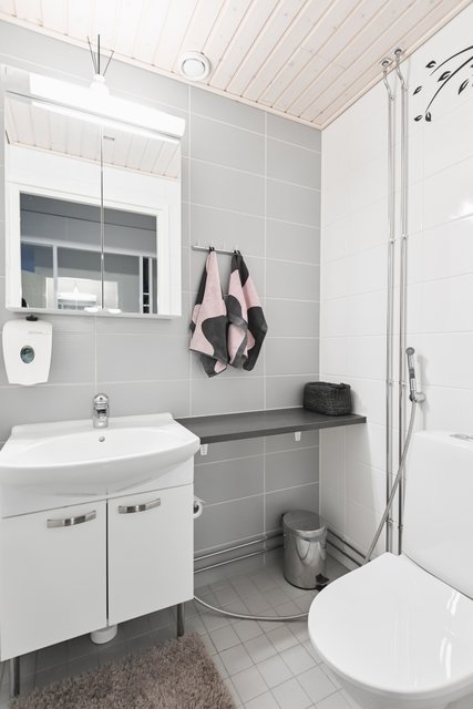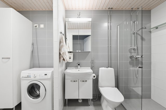 - WC-istuin, suihkuseinä, pesukoneliitäntä, lattialämmitys, peilikaappi, allaskaappi, ja bidee-suihku