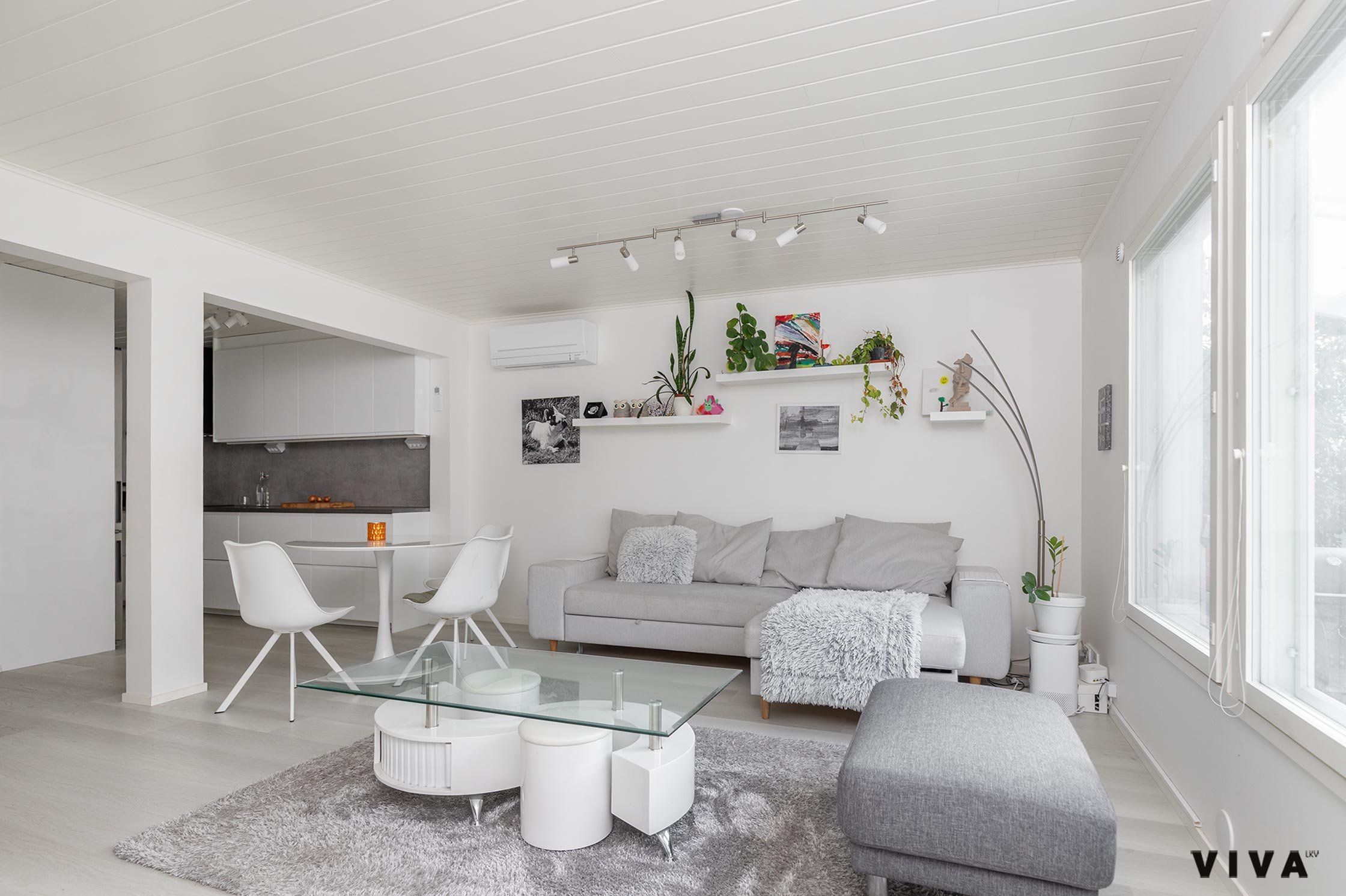 Asunnon pinnat ovat vaaleita ja isoista olohuoneen ikkunoista tulee luonnon valoa hyvin asuntoon. Pohjaratkaisu on erittäinkin toimiva lapsiperheen arkeen.