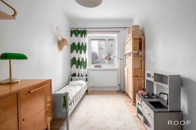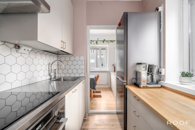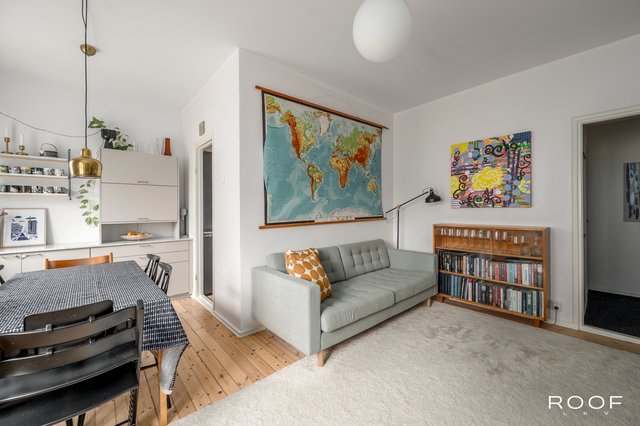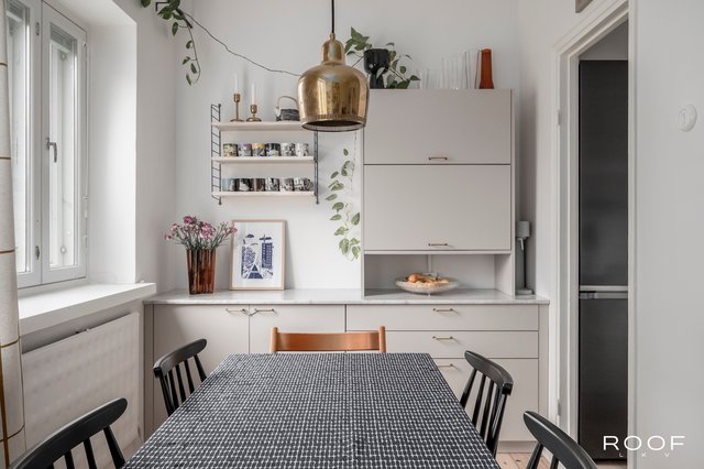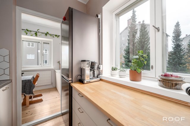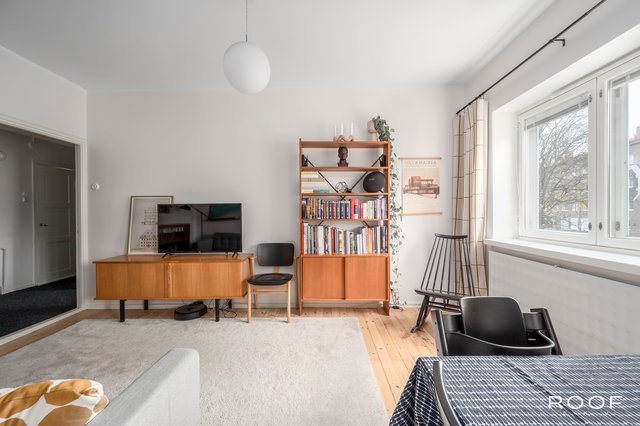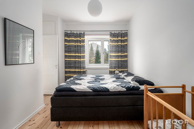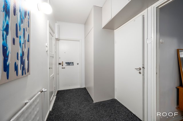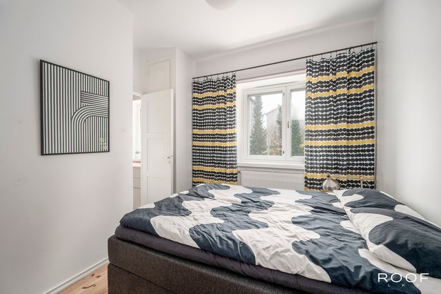 Olohuone ja ruokailutila muodostavat yhtenäisen ja käytännöllisen kokonaisuuden, jonka äärellä on helppo viettää aikaa. Keittiö on uudistettu ja varustettu tämän päivän mukavuuksilla, kuten induktioliedellä ja jääkaappipakastimella. Molemmat makuuhuoneet soveltuvat hyvin niin nukkumatiloiksi kuin työhuoneiksi, ja niissä on mukavasti säilytystilaa – alkuperäisten komeroiden lisäksi toisessa makuuhuoneessa on uusi vaatekaappi. Eteisessä on syvä ja koko huonekorkeuden hyödyntävä kaapisto. Kylpyhuoneessa on paikka pesukoneelle.