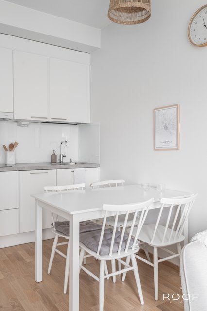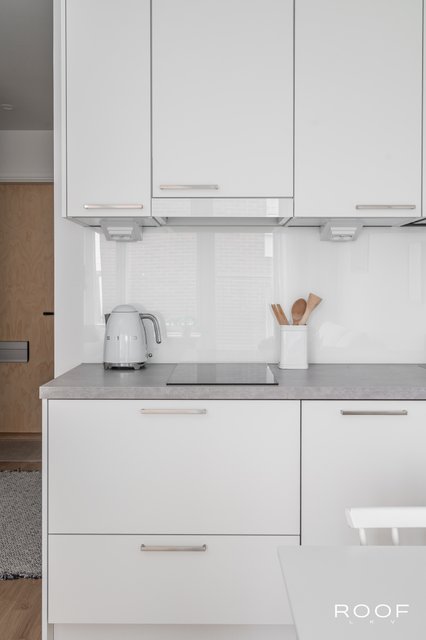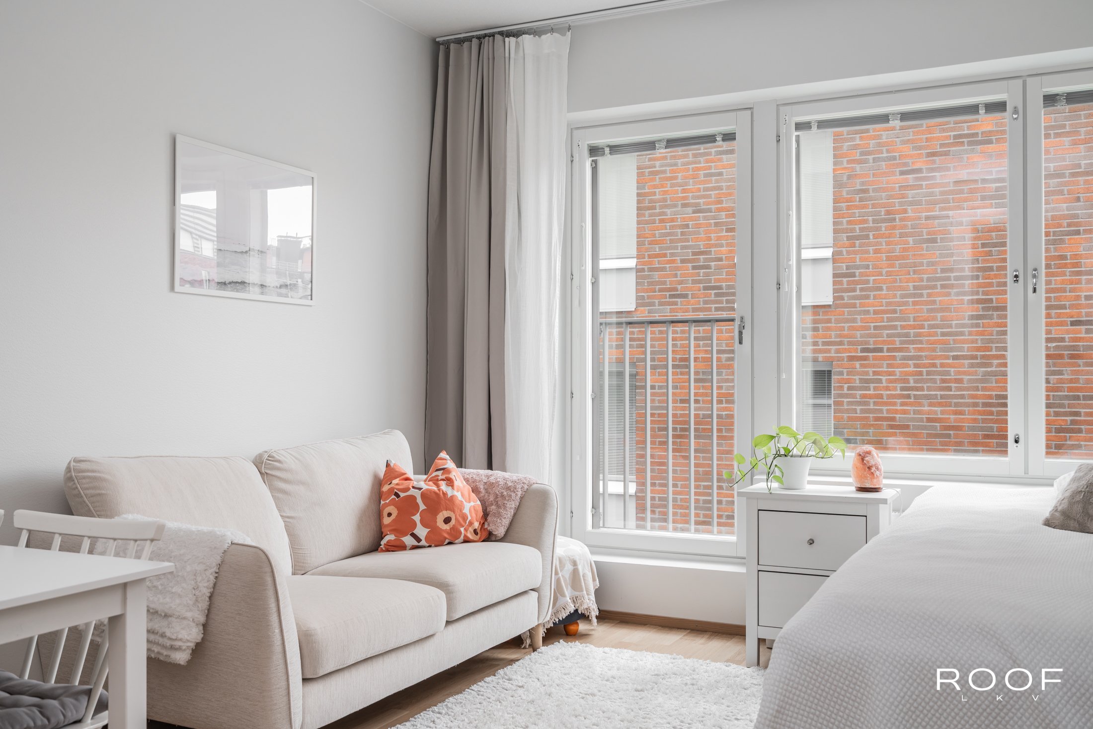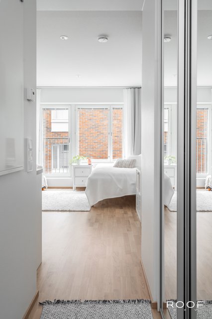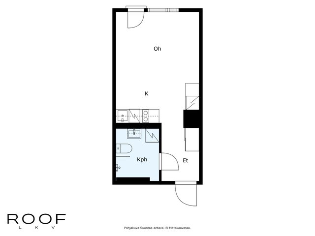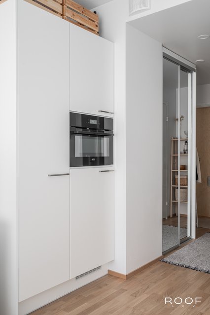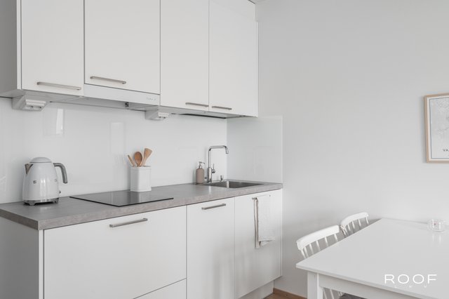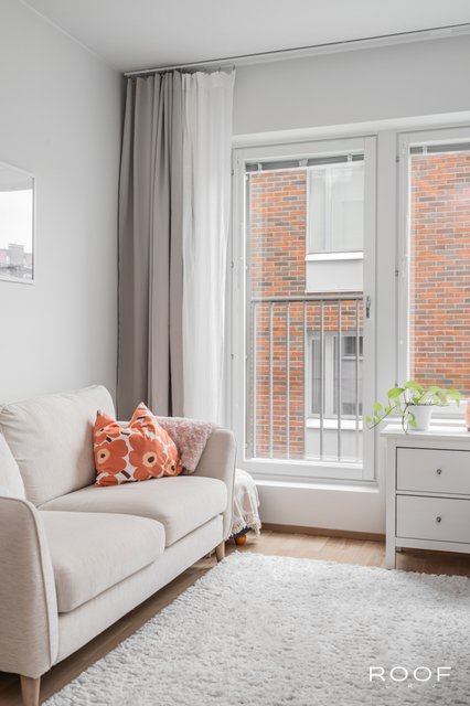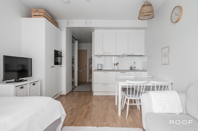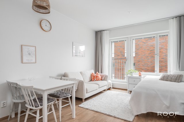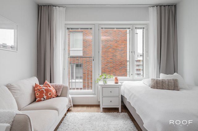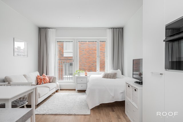 Huoneistossa on riittävästi tilaa niin sängylle, sohvalle kuin ruokapöydällekin. Keittiö sijoittuu kahdelle seinälle, joten säilytystilaa on myös riittävästi. Korkea huonekorkeus ja iso ikkuna takaavat valoisuuden ja avaruuden tunnun.
