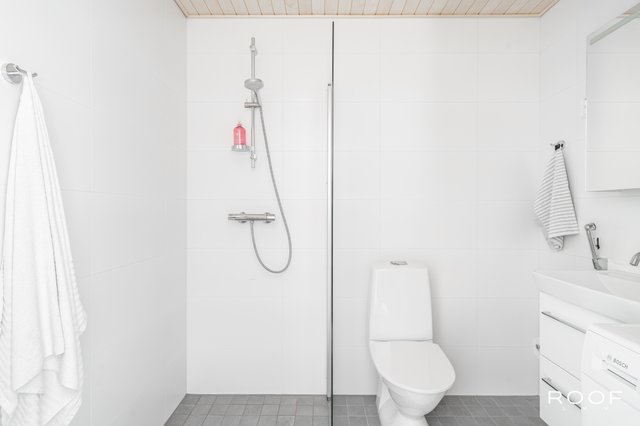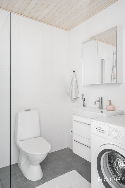 - WC-istuin, suihku, suihkuseinä, pesukoneliitäntä, lattialämmitys, bidee-suihku, ja peili
