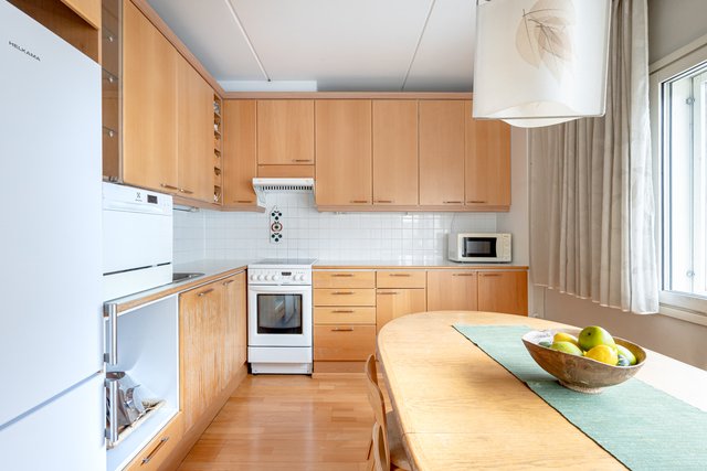 - Tilava keittiö, jossa kahdella seinällä kaapistoja ja tasotilaa. Keittiö on uusittu arviolta 90-luvulla, joten elämisen kulumista selkeästi havaittavissa. Keittiöön mahtuu tilava ruokapöytä. Kodinkoneita ei ole hetkeen käytetty, eli niiden kunnosta ei ole tarkkaa tietoa.