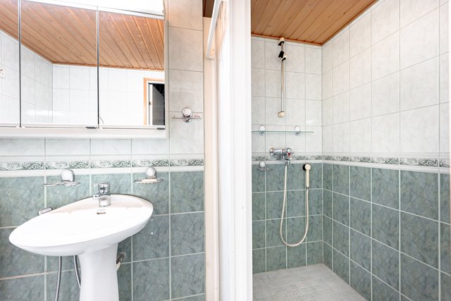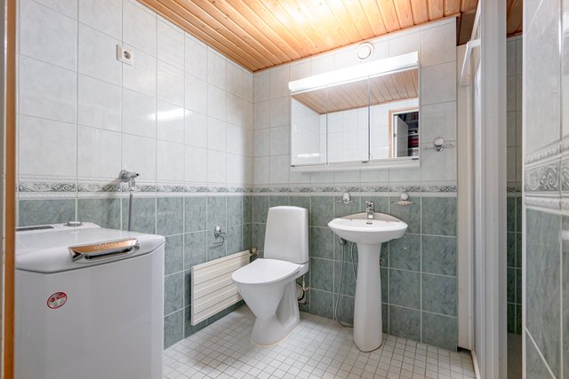 - WC-istuin, suihku, suihkuseinä, pesukoneliitäntä, peilikaappi, pesuallas, ja bidee-suihku