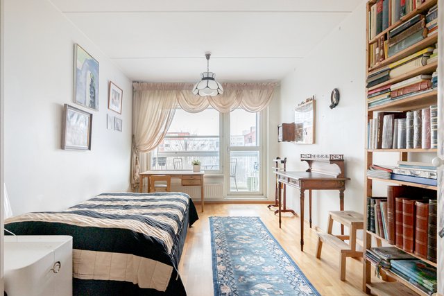 - Isohko makuuhuone, johon mahtuu mainiosti niin sänky kuin työpöytäkin etätyöskentelyä varten. Makuuhuoneesta kulku lasitetulle parvekkeelle.