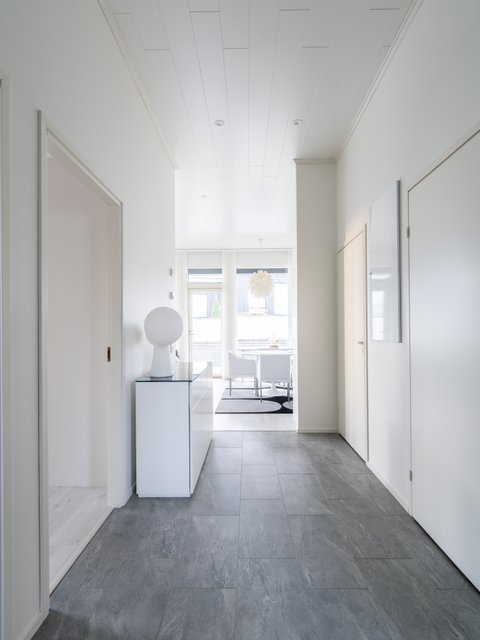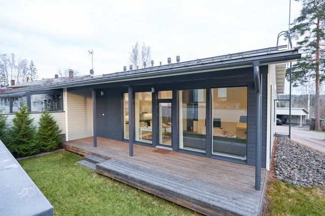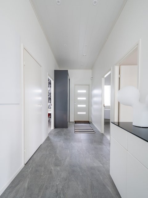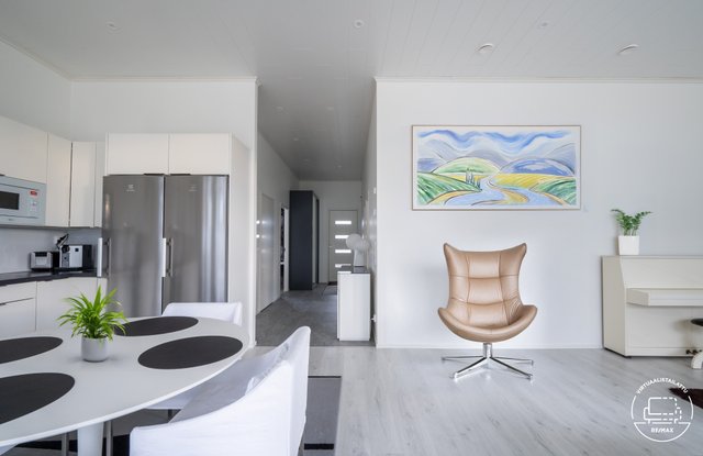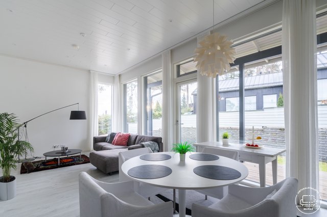 Korkea huonekorkeus, suuri olohuone, jonka yhteydessä keittiö, tilava kodinhoitohuone, sauna sekä kaksi wc:tä tekevät arjesta sujuvaa. Olohuoneesta avautuu kulku omalle terassille, jossa on mukava nauttia. Korkea, 3,2 metriä, huonekorkeus ja suuret ikkunat luovat avaran ja valoisan tunnelman. Kolme makuuhuonetta, joista yhdessä on vaatehuone, tarjoavat runsaasti tilaa perheen tarpeisiin.