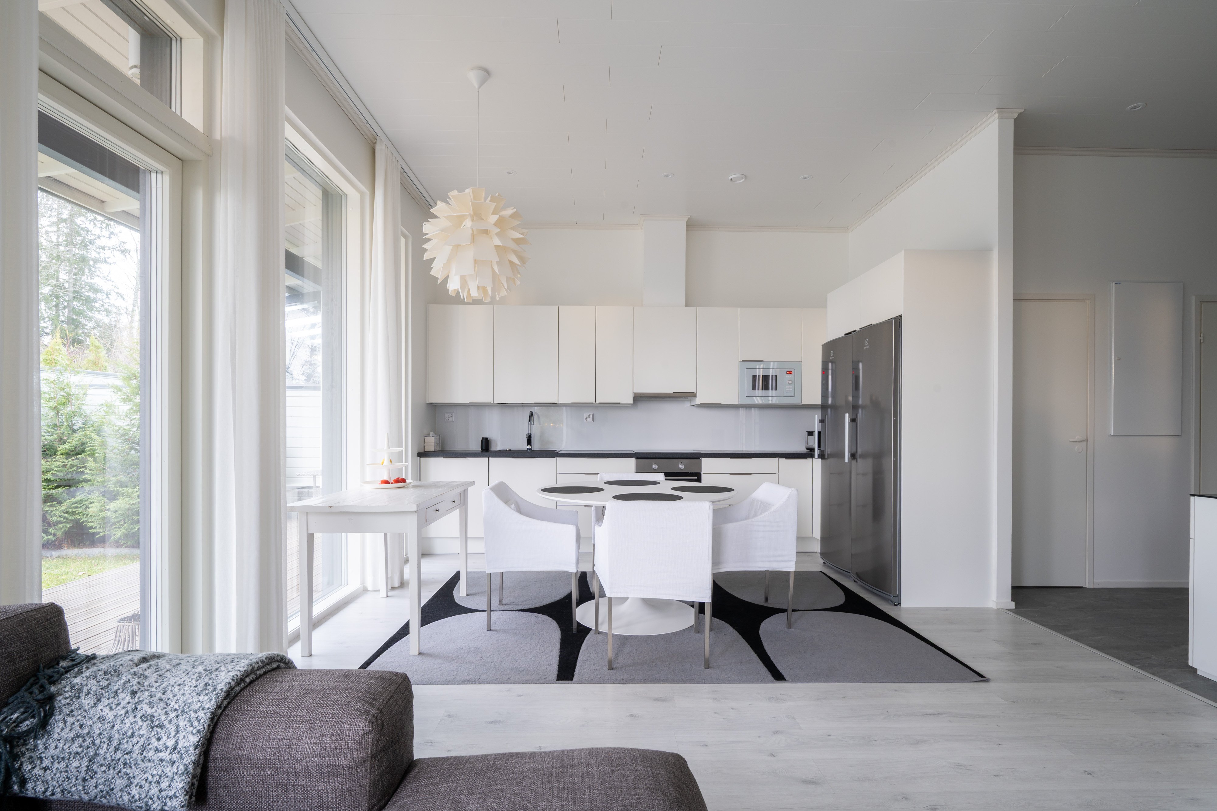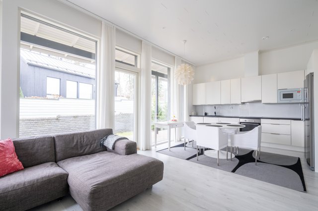 - Keittiön yhteydessä tilava olohuone. Olohuoneesta kulku terassille.
