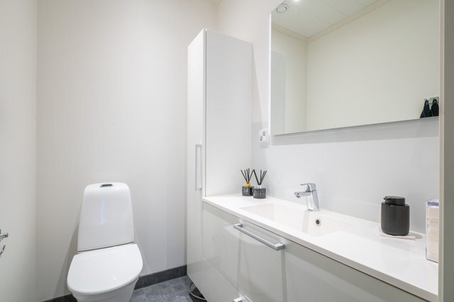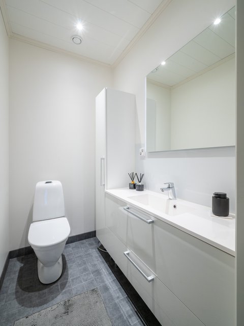 - WC-istuin, suihku, suihkuseinä, lattialämmitys, bidee-suihku, peili, ja allaskaappi