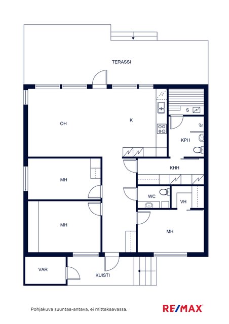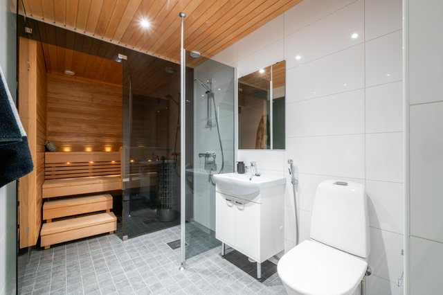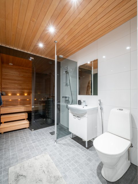 - Tilava pesuhuone, jonka yhteydessä sauna. Pesuhuoneessa myös wc.