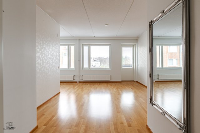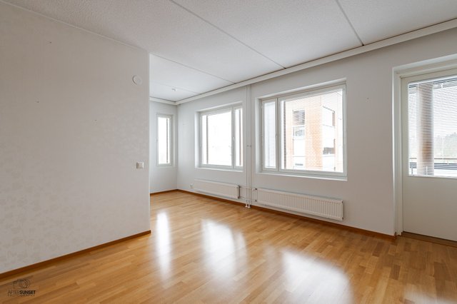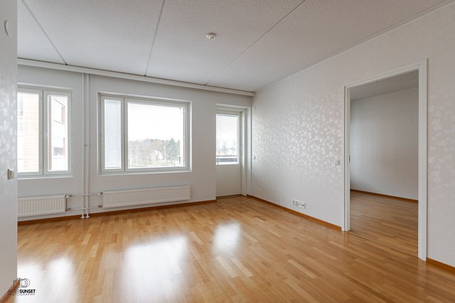 - Valoisa olohuone. Lattiassa parketti, seinissä maalipinta. Käynti parvekkeelle.