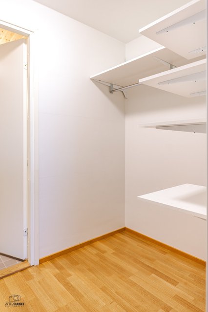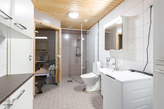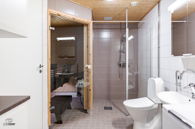 Keittiö on valoisa ja käytännöllinen ja siellä on runsaasti kaappitilaa sekä tilaa ruokapöydälle. Makuuhuone on tilava ja sen yhteydessä on erillinen vaatehuone, joka tuo lisää säilytystilaa. Kylpyhuone on moderni ja varustettu lattialämmityksellä ja oma sauna tarjoaa mahdollisuuden rentoutua milloin tahansa.