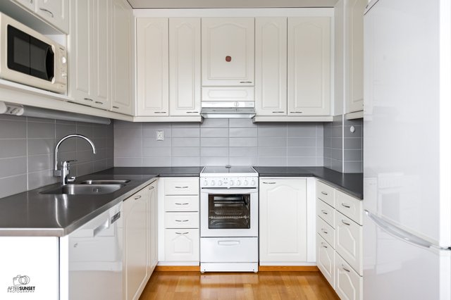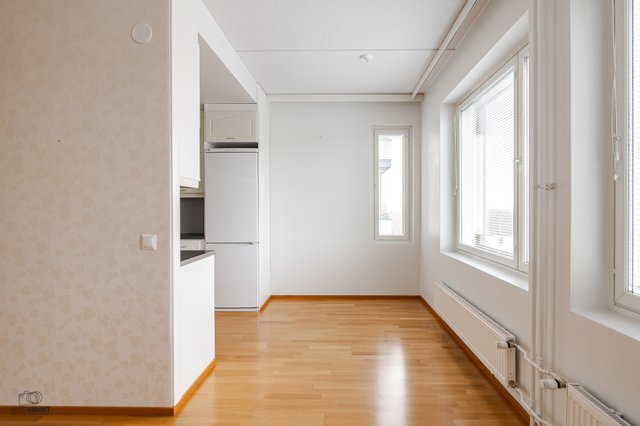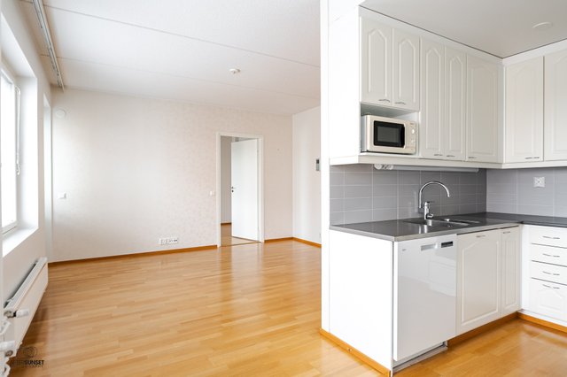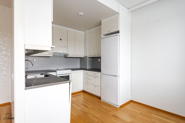 - Hyvin kaapistotilaa ja tila keittiön pöydälle. Valoisa. Lattiassa parketti.
