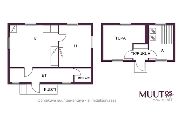 - Pinta-alat perustuvat myyjältä saatuihin tietoihin ja rakennuspiirustuksista laskettuihin arvioihin. Pinta-aloja ei ole tarkistusmitattu, mitattaessa pinta-alat saattavat olla ilmoitettua suurempia tai pienempiä. Kohteen kauppahinta ei ole osaksikaan pinta-alaperusteinen vaan perustuu kokonaisuuteen. Rakennuspiirustusten mukainen saunarakennuksen kerrosala 18 m2. Päärakennuksen rakennusala on ulkomittojen mukaan arviolta n. 45 m2. Talousrakennuksen rakennusala on ulkomittojen mukaan arviolta n. 96 m2. Päärakennuksesta- ja talousrakennuksesta ei ole saatavilla rakennuspiirustuksia ja näiden pinta-alat on ilmoitettu asemapiirroksesta lasketun arvion ja rakennusrekisterin mukaan. Asuintilojen pinta-ala on laskettu rakennuspiirustuksista ja siihen on huomioitu kaikki asuinkäytössä olevat tilat, muihin tiloihin on laskettu saunarakennus.